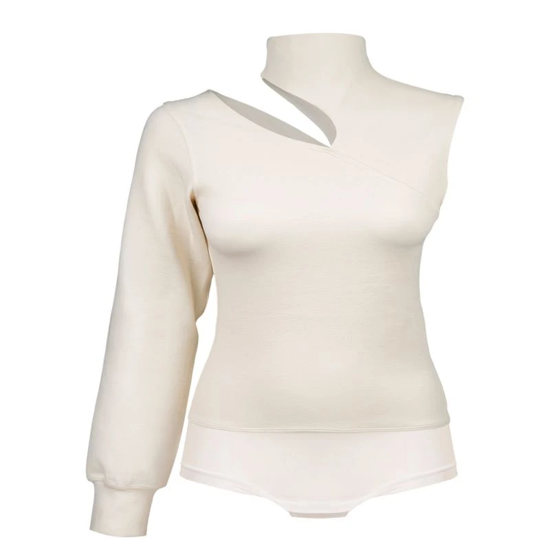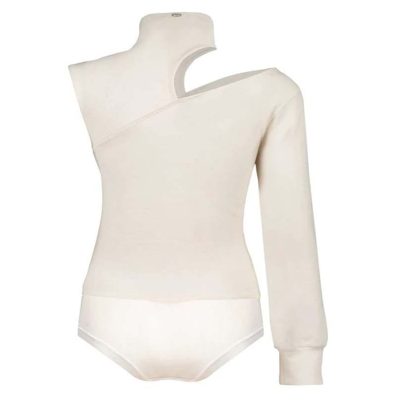 This is a Light, textured sweat fleece body. Featuring an asymmetric shape, wide sleeves, a high collar and chest cut-out detail. Including Tulle panties with snap button closure at the crotch to take on and off more easily. Panties are lined with micro modal fabric. The body includes a Figure-hugging fit and is Short in length.