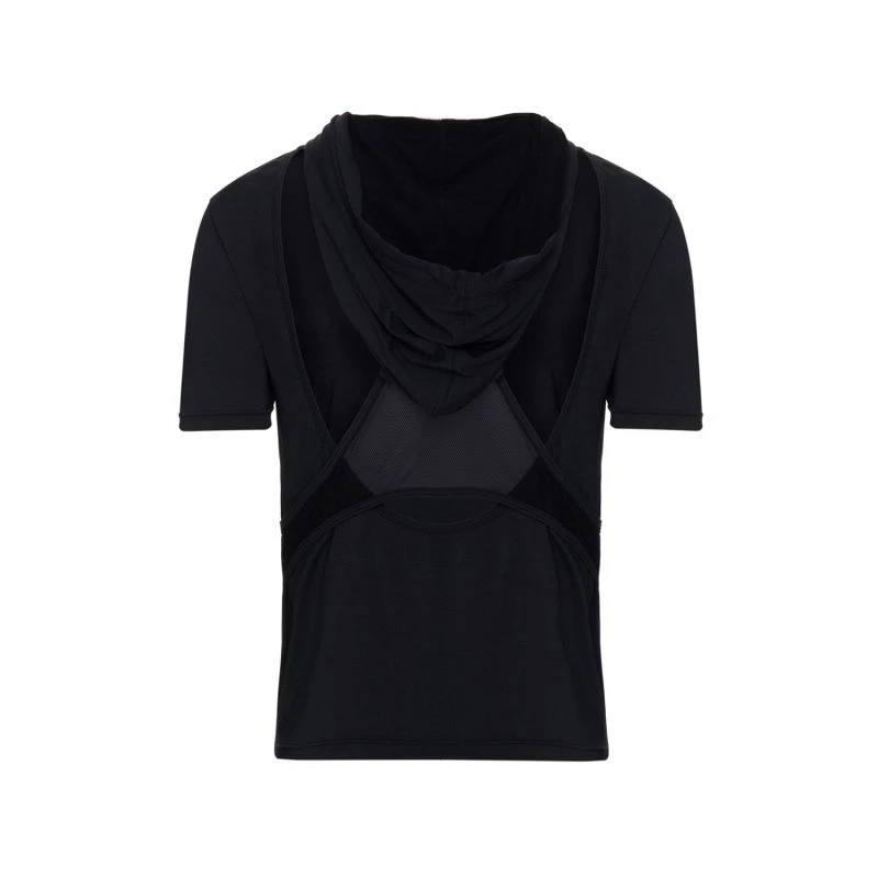 -Wide round neckline on the back with overlapping swimmer-style mesh detail.
