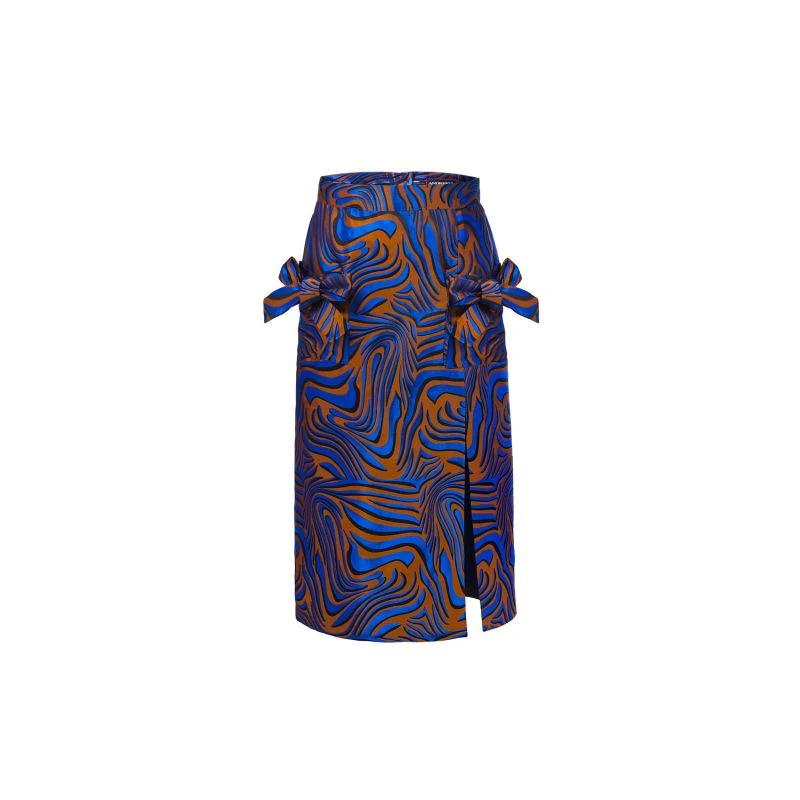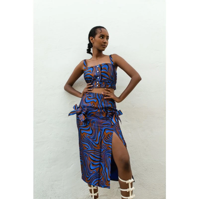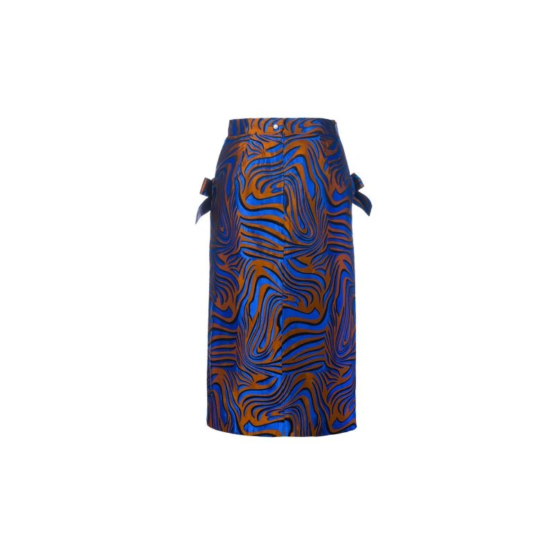 Blue printed skirt decorated with epaulette details. Zebra print creates perfect look and perfect for a day or night.