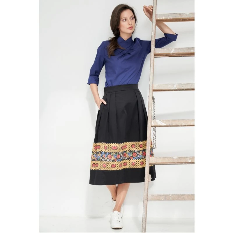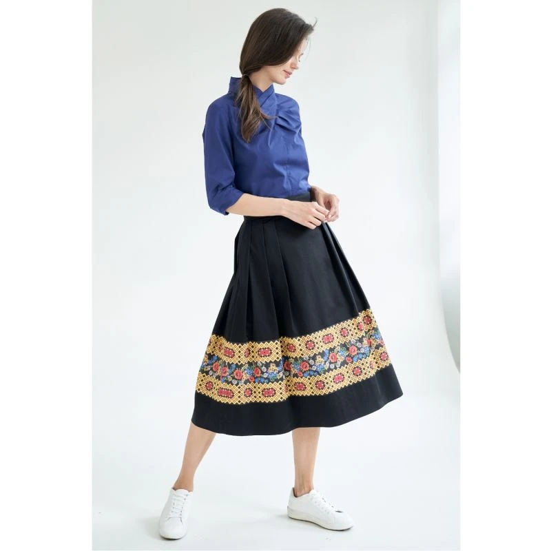 The A-line skirt we can’t stop staring at, this little black number has polished accordion pleats at the sides and a retro needlepoint-inspired print near the edge. In a timeless silhouette with a set-on waistband and hand pockets, this cotton skirt looks nice, feels great and can be worn with the majority of your tops – or nearly all of our blouse offerings.