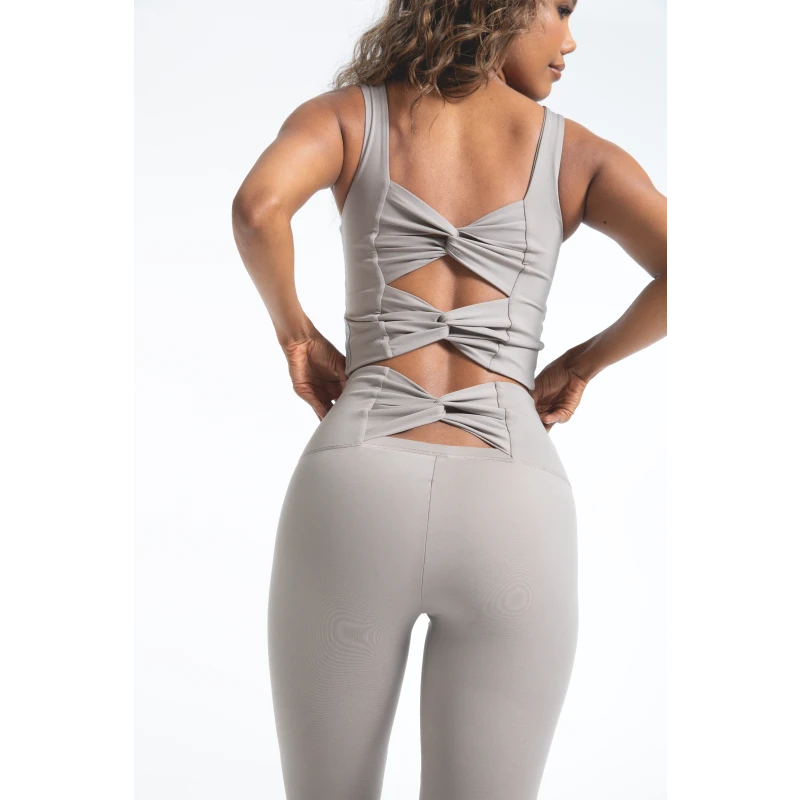 We designed the Bow Long Bra for those who get excited with a fancy back design and still want a good supporting bra at the same time. It is a long bra with double layers of main body fabric, one layer of thin lining, and removable paddings inside. It also has a hidden inner elastic band on the chest area to increase grip and recovery. The bustier has a length that covers our belly and extends to the waist of the leggings.Of course, we continued our square neck tradition, as we thought the square neckline, one of our favorite lines, would suit this model and you very well.