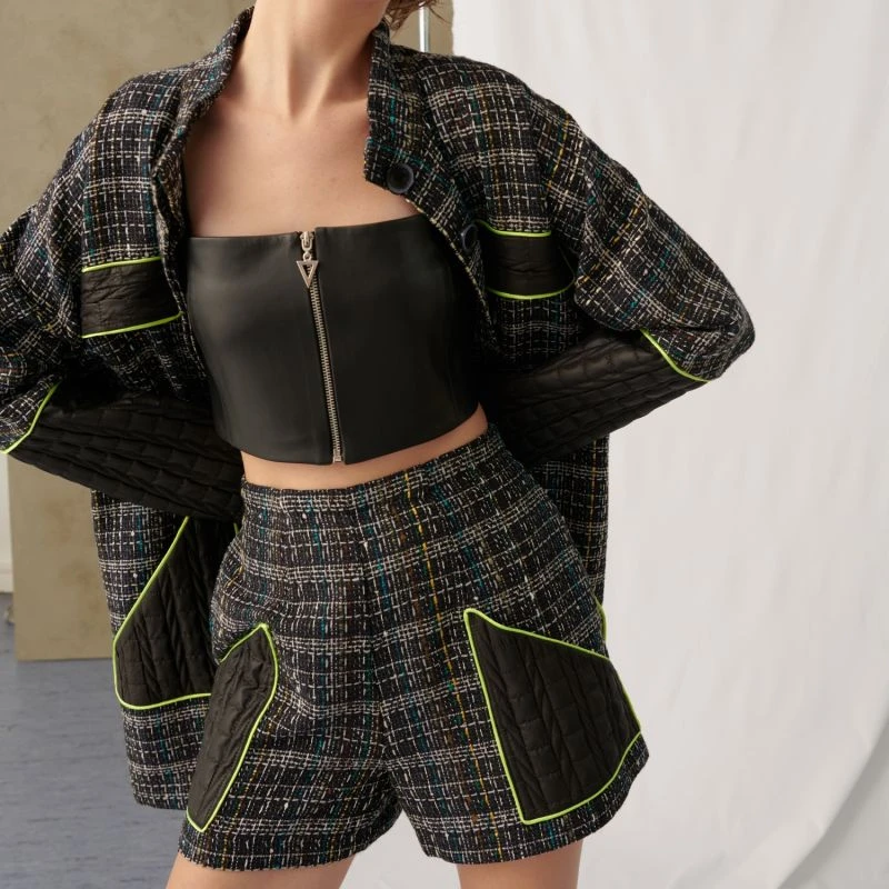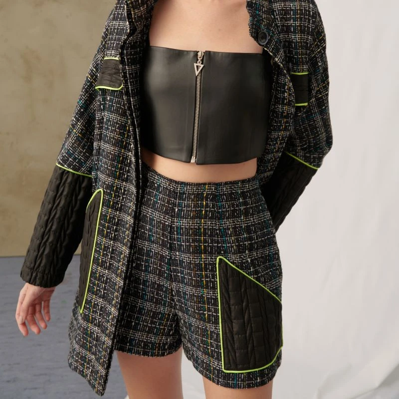 Tweed short that stands out with a puffer detail. It has a high waist and side pockets