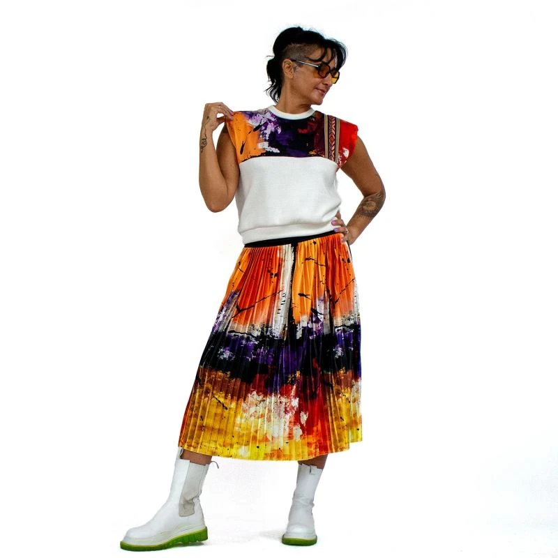 This skirt and our “Sleeveless Padded Blouse With Colorful Abstract Prints” are great compliments to each other.