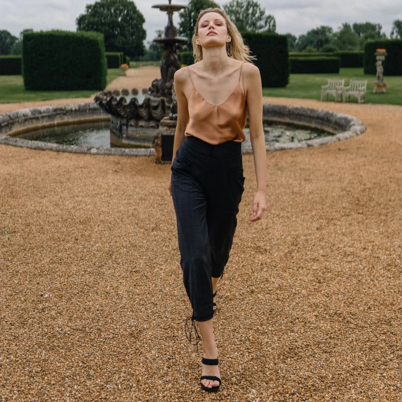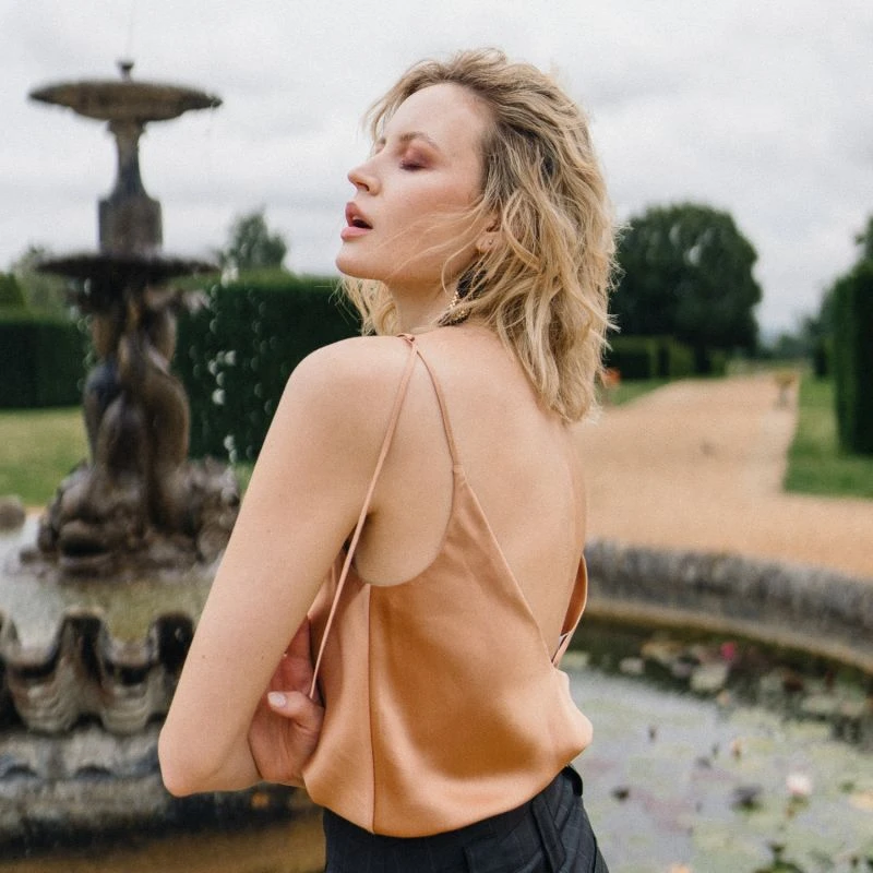Double lined and made with 100% Italian Silk Satin. The Cosette cami top is loose-fitting, naturally lightweight, and fluid. The tie-up feature on the shoulders is a lovely detail but also makes our cami top adjustable so you can drop the neckline or lift it depending on your preference or body shape. Cosette has a low back that elegantly exposes the shoulders.