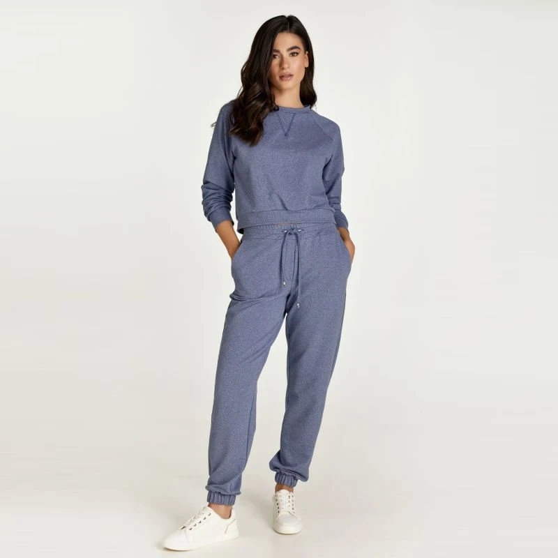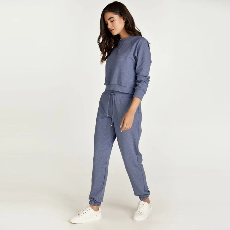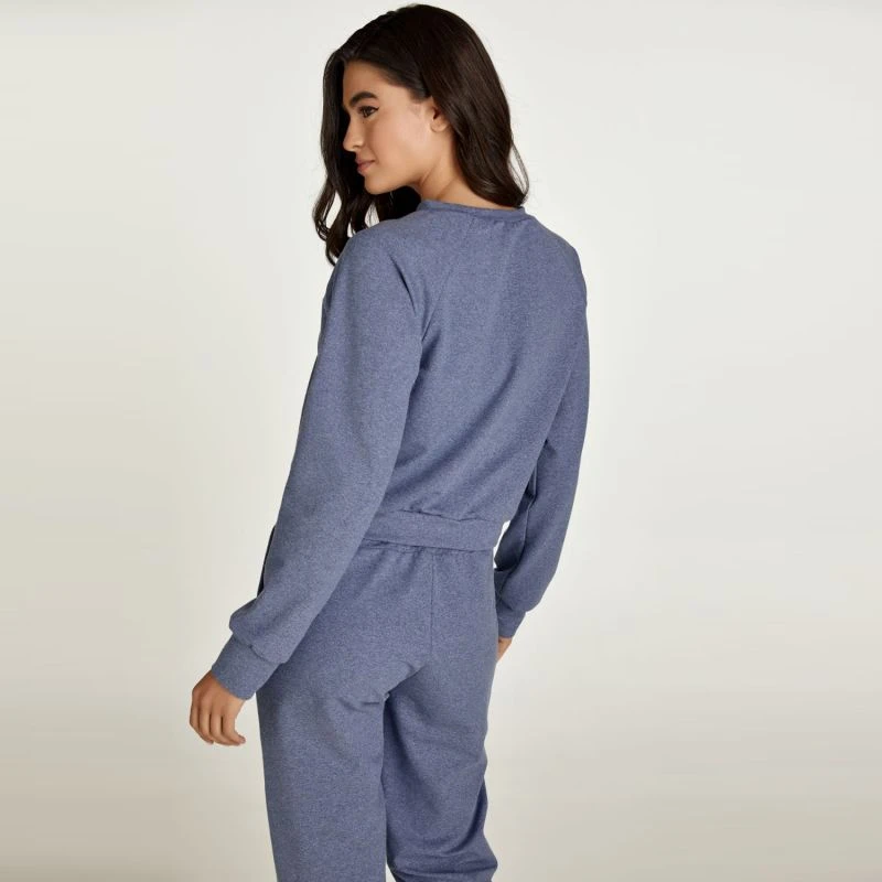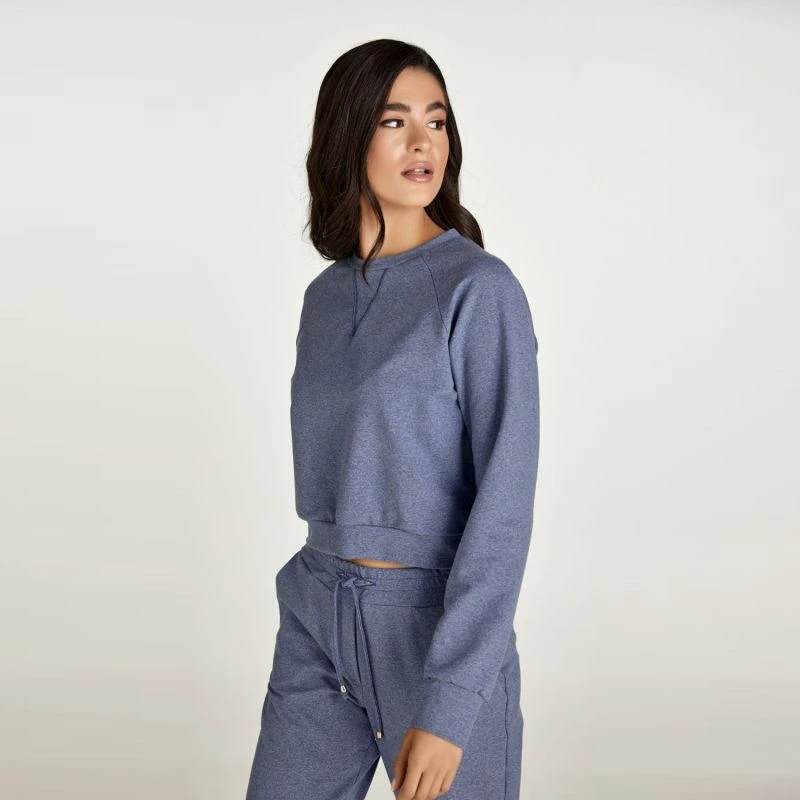 This indigo mélange crop sweatshirt is crafted in stretch jersey fabric. It has long raglan sleeves with cuffs and a round neckline. There is triangular stitching detail below the neckline in dark blue thread.