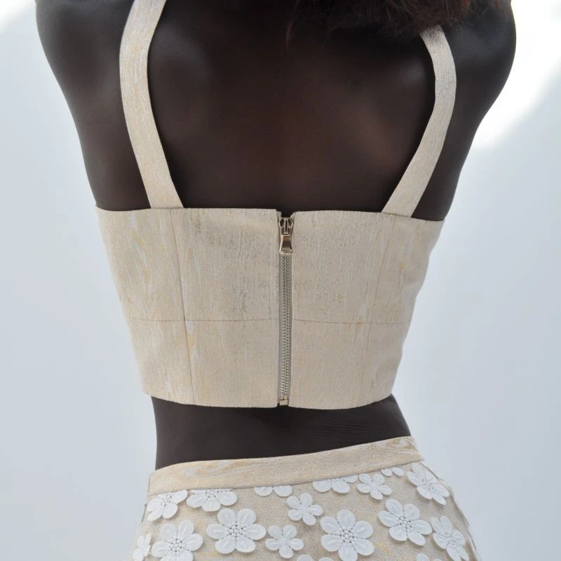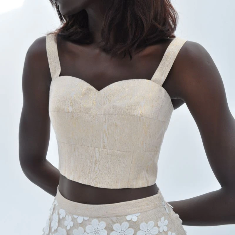 Simple and versatile, this top is made from mixed fabric with metallic thread and is fully lined with viscose material. Pair it with jeans, a suit, an A-line skirt, or a “power suit”. It has a subtle sweetheart neckline and a metallic back zipper for flexibility and comfort.