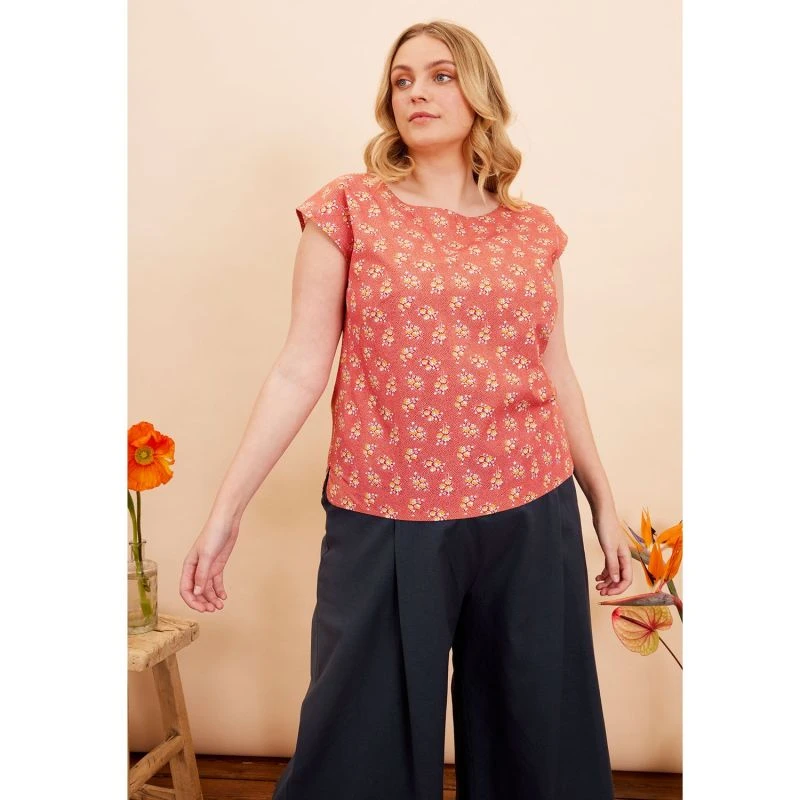 The Edna Top epitomises simple elegance. It features a crew neck, neat cap sleeves and a keyhole with button fastener at the back. Versatile enough for any date in your calendar, the pretty print is easy to style with trousers or a full skirt.