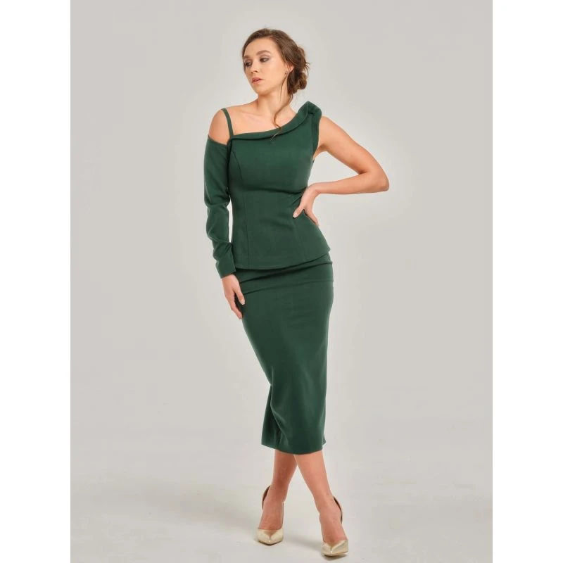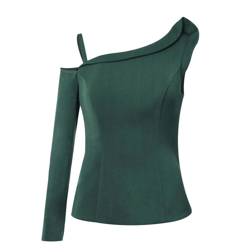 Bring an air of effortless femininity to your edits with this dark green one-shoulder top. Featuring Tia Dorraine’s iconic stretch crêpe fabric, it has an asymmetric neckline and a single long sleeve with a tiny, elegant strap. The figure-flattering silhouette fastens with a metal zip at the back and is fully lined with silky satin.