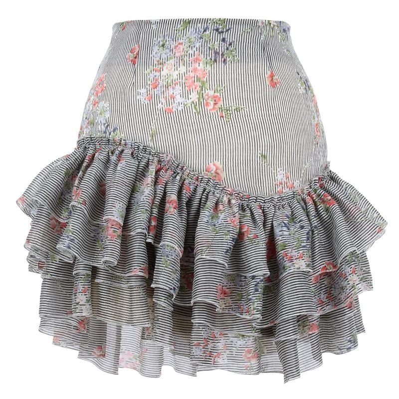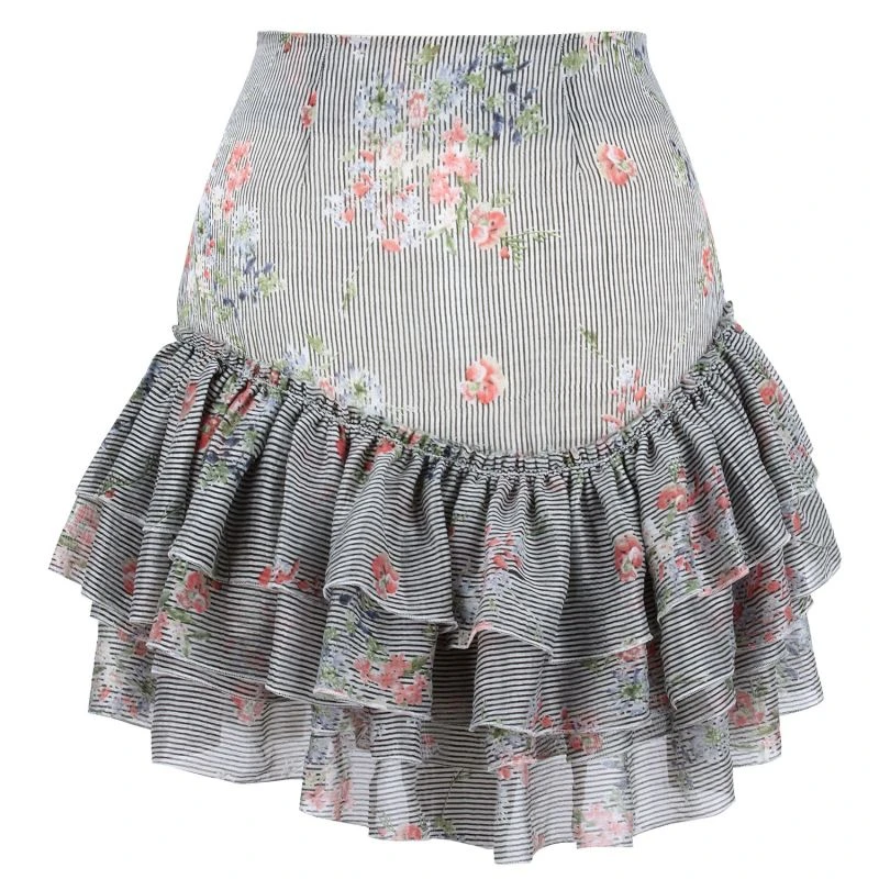 Restyling the classic midi to a gathered print mini skirt, patterned with ditsy blooms and delicate stripes, this ultra feminine piece features a fully lined fitted yoke and is trimmed with four layers of gathered frills.