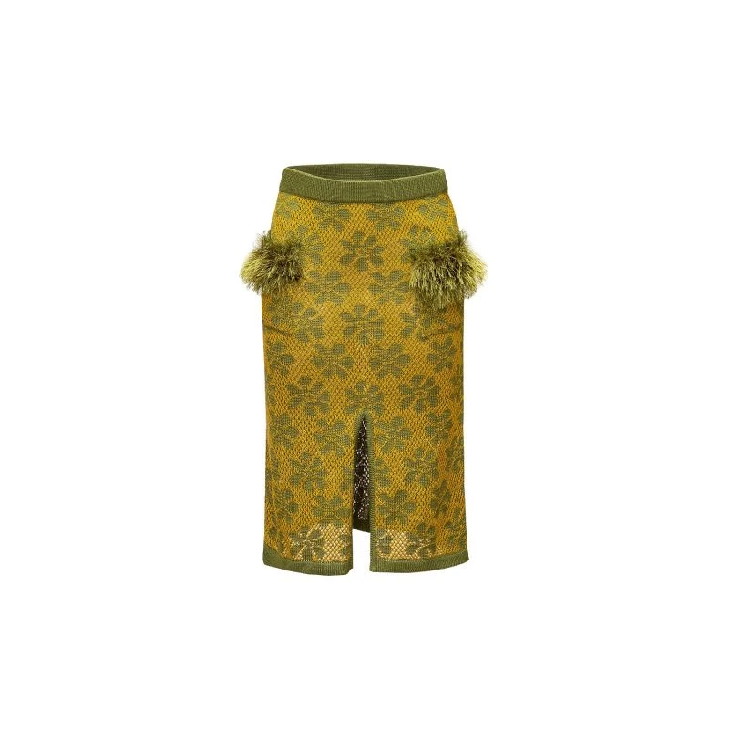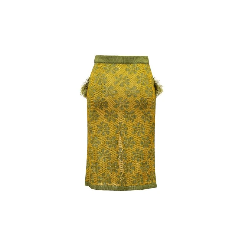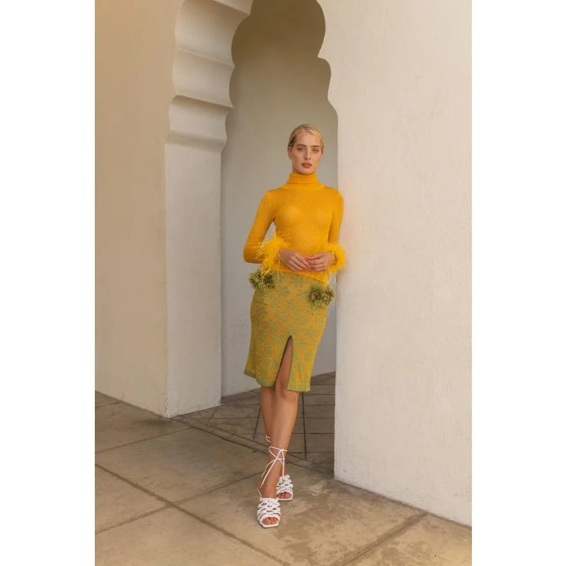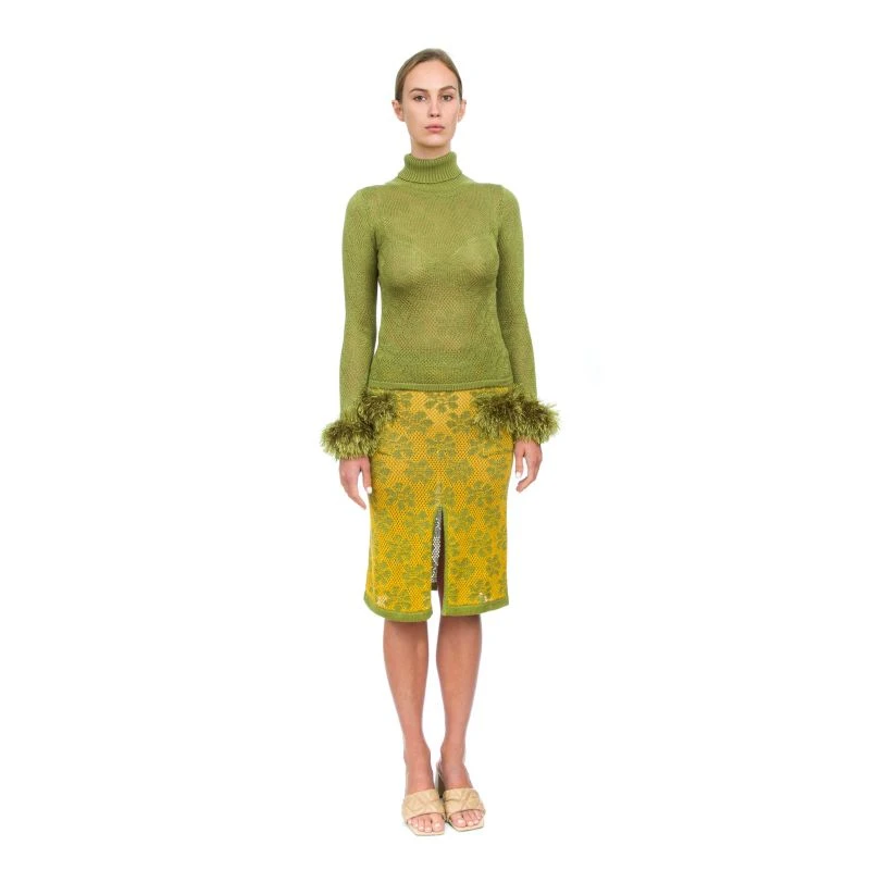 Green Knit Skirt With Handmade Knit Details is cut from lightweight high quality knit with a hint of stretch. The skirt has floral print and handmade knit details on the pockets. Style the skirt with Yellow Knit Turtleneck With Handmade Knit Details and a pair of mules.