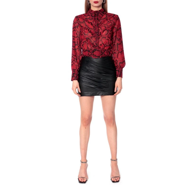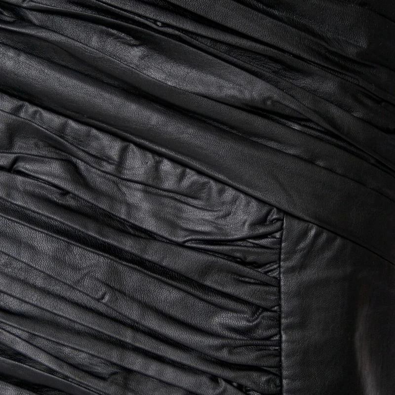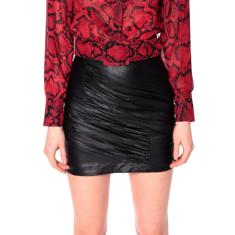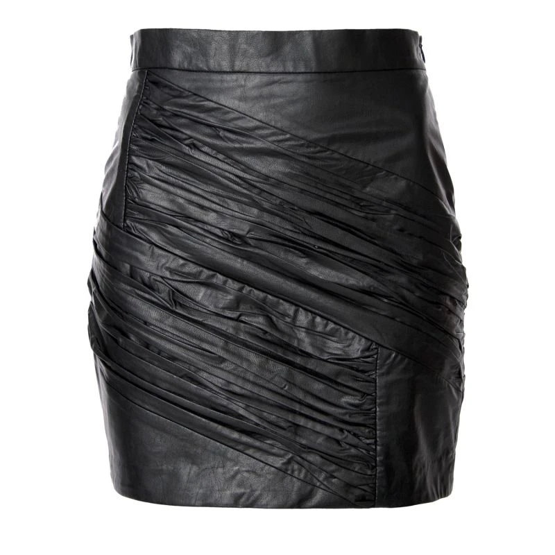 Fitted mini skirt crafted from soft vegan leather. Diagonal creases give the design an interesting structure and create a feisty, rock character of the 80s.