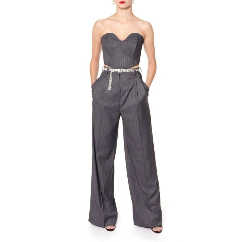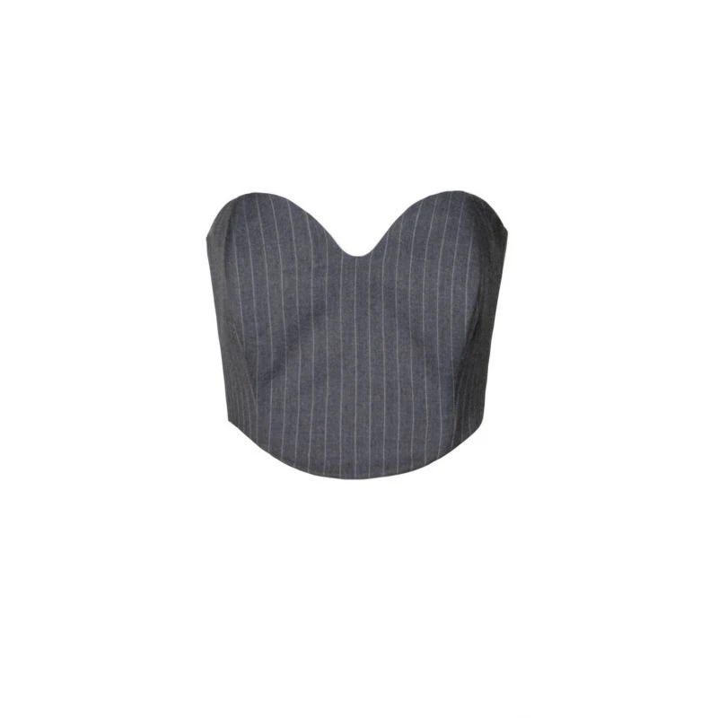 Corset top with a beautiful, sensual neckline. A perversely feminine cut made of a suit fabric with a tennis stripe. Design entirely on the lining, modelled with underwires, fastened at the back with a covered zipper. Wear it with the TIFFANY jacket in everyday styling or wear it with GWEN pants and choose a piece of large, flashy jewellery to create an original evening look.