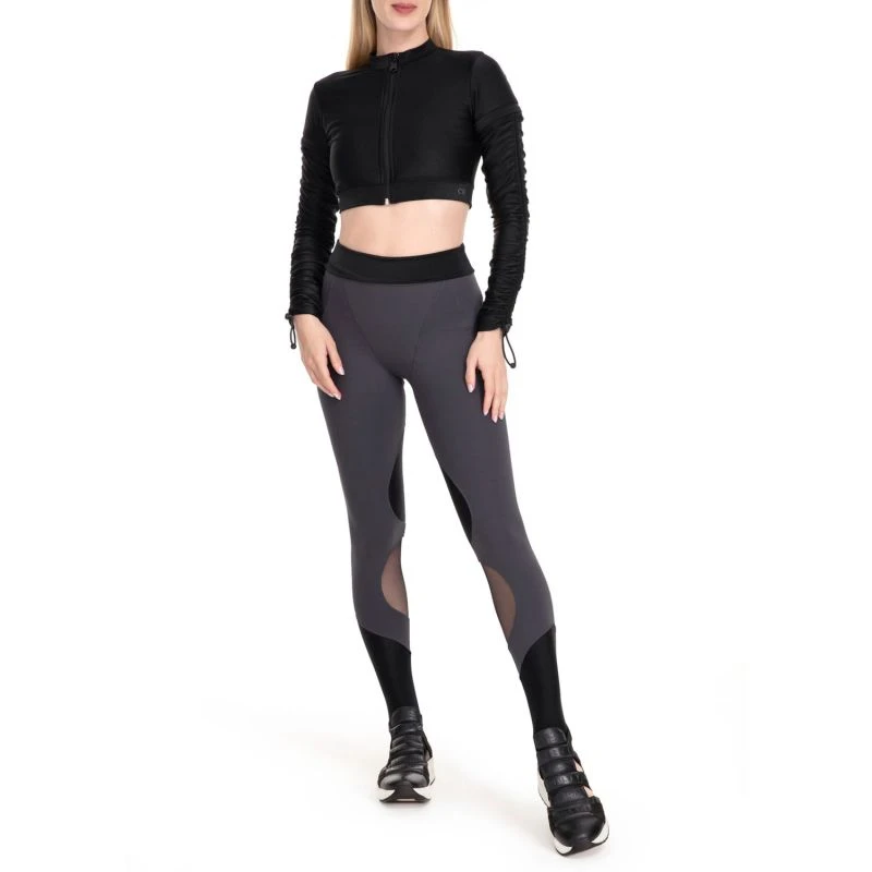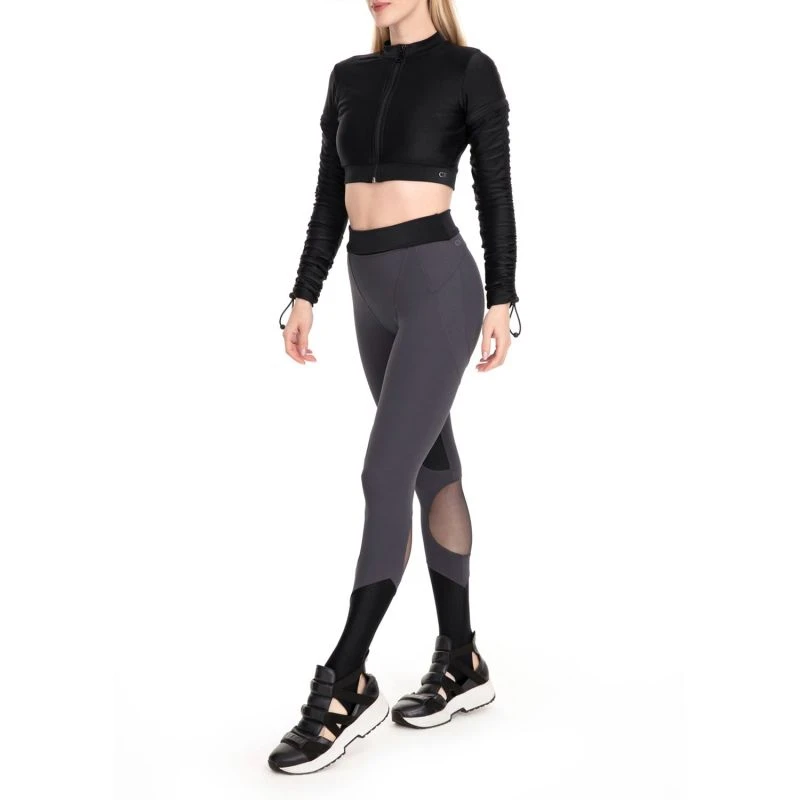 High-waist leggings with a high folding waistband that shapes and enhances the silhouette, with compression, soft touch, thermal comfort, UV protection, and silicone and internal elastic for better comfort and support. With cutouts that aim to highlight the body’s natural musculature, the Trilobal Fit fabric has an iridescent shine and is present on the waist and legs, lined with Emana® fabric, and the tulle cutouts are present on the calf and have a slight effect of particles of shine.