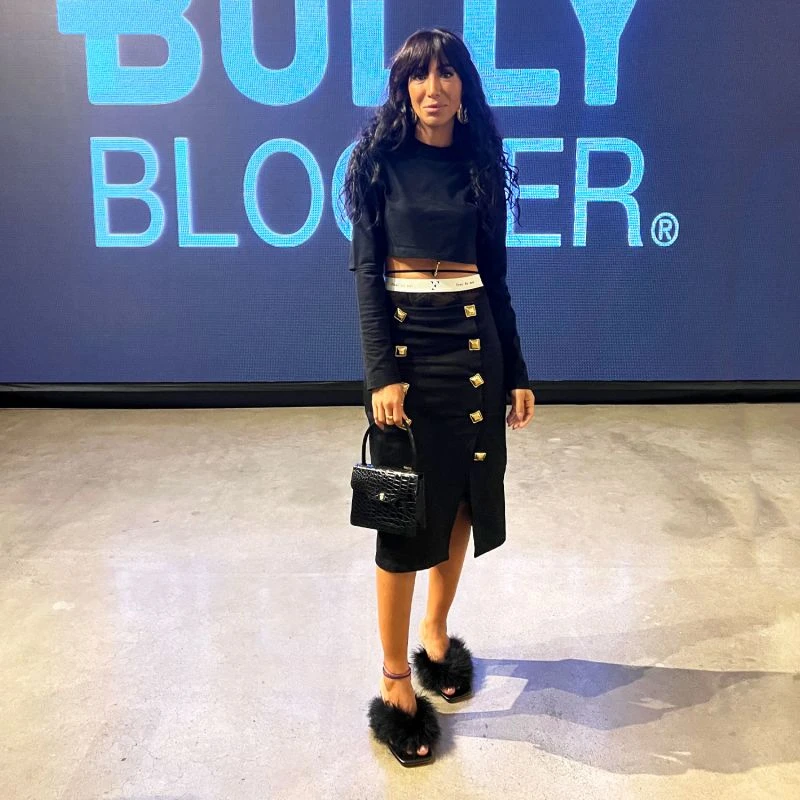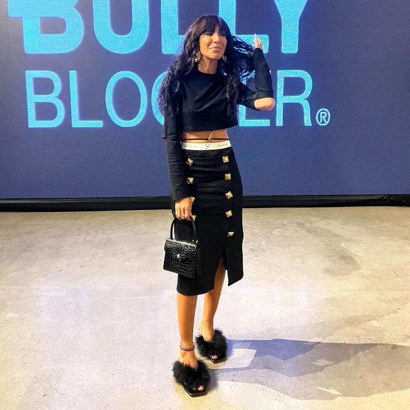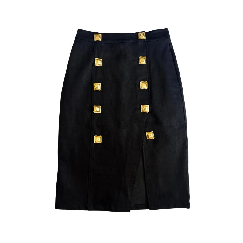 This skirt embodies the combination of high end fashion and streetwear comfort and edge. It is part of the elevated “Majorelle” collection celebrating luxurious details. Cut in a light-weight stretchy denim, it has a classic pencil skirt shape. The front is decorated with vintage inspired gold buttons, opened on a slit. Wear yours with the matching bomber jacket and knee boots for fall.
