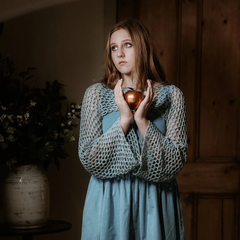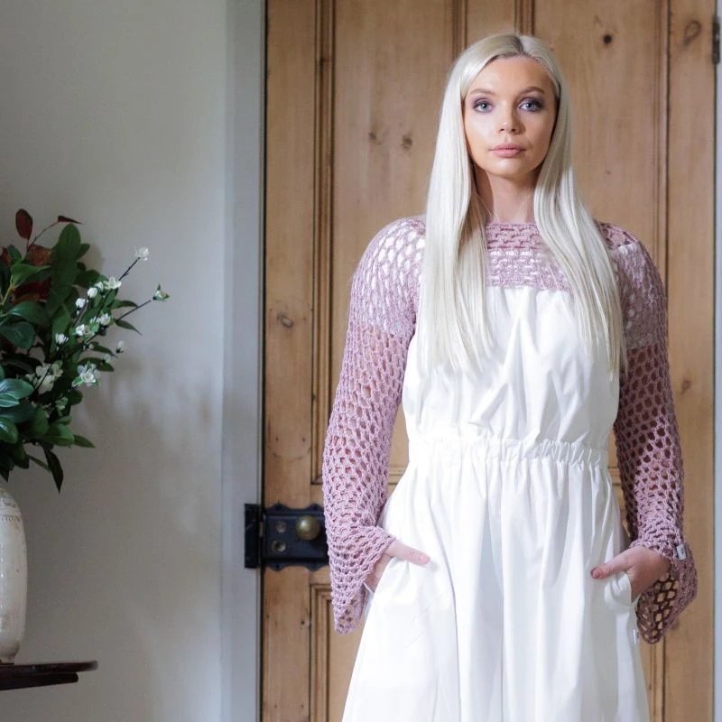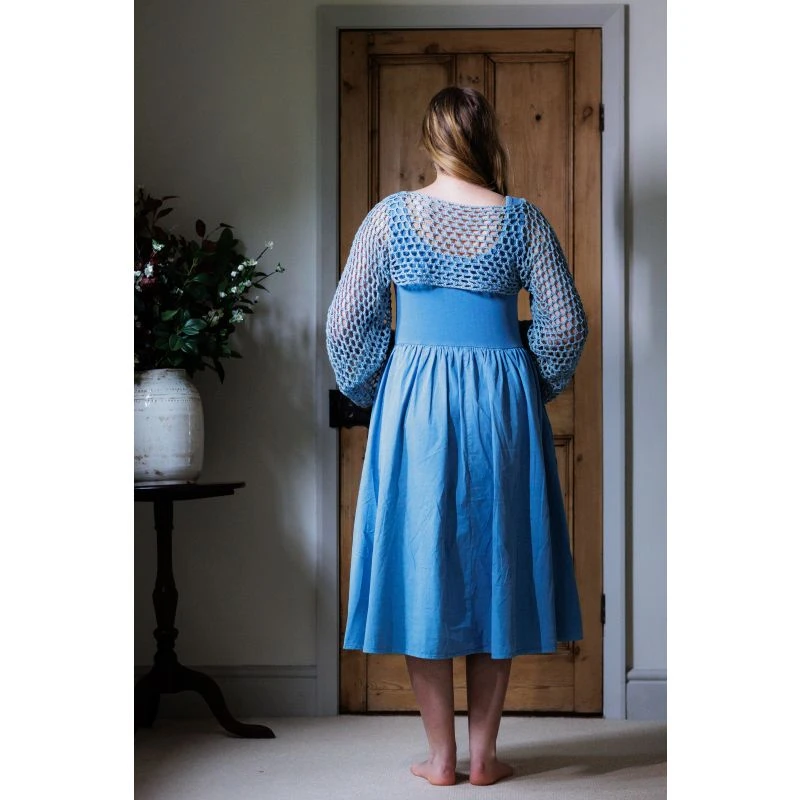 Tale: Our Nancy Crochet Top is super cropped and great as an elegant addition to vest tops and dresses. Face the world in this intricate top that has been hand crocheted in the UK by Nancy. The yarn is a very soft organic cotton. The bell sleeved adds drama and style and the small Frock Tales logo is a cute cuff feature. Our model in Wedgwood is 5ft 7″ and wears a size small  and our model in Enchanted Pink is 5ft 5″ and wears a small. Made in Great Britain from 100% Organic Cotton by Nancy, part of our wonderful Frock Tales team.