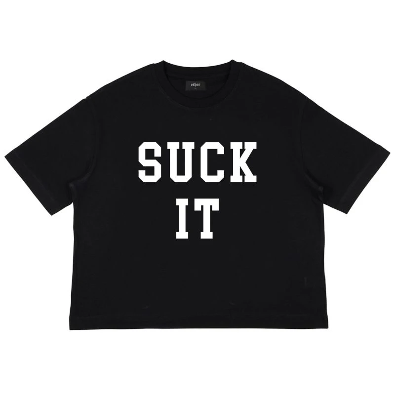 Unleash your rebellious spirit with the “Suck It” cropped t-shirt. Featuring a bold rock-inspired text print on the front, this classic cropped tee embodies edgy style and confident attitude in one. Made for those who stand out and aren’t afraid to make a statement, its timeless silhouette ensures both comfort and a trendsetting look. Whether you’re channeling your inner rockstar or making a daily statement, this t-shirt is the perfect choice.