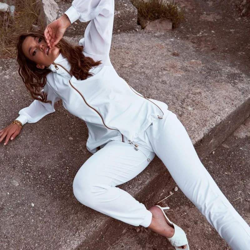 The Panacea Track Jacket is perfect for those who want to look glamorous while still being comfortable. Made of luxurious, breathable ECONYL® fabric, this tracksuit combo is the perfect addition to your wardrobe. Featuring a stand-up collar and long-length chiffon raglan sleeves. The track jacket is decorated with golden side zips, elastics and golden cord ends for an extra touch of glamour. Pairs perfectly with the Elegant tracksuit bottoms.