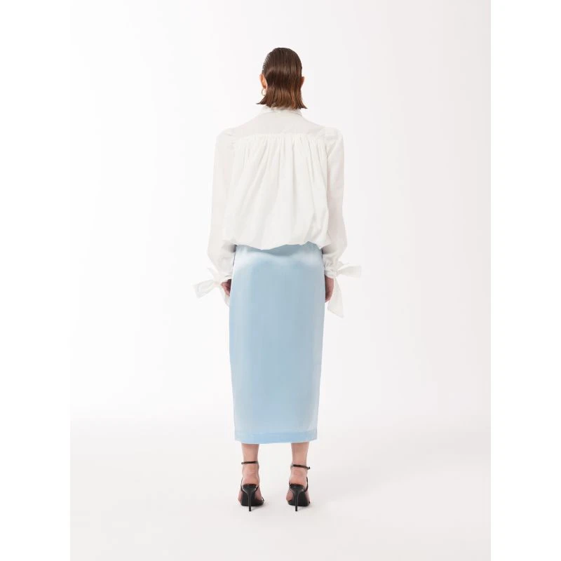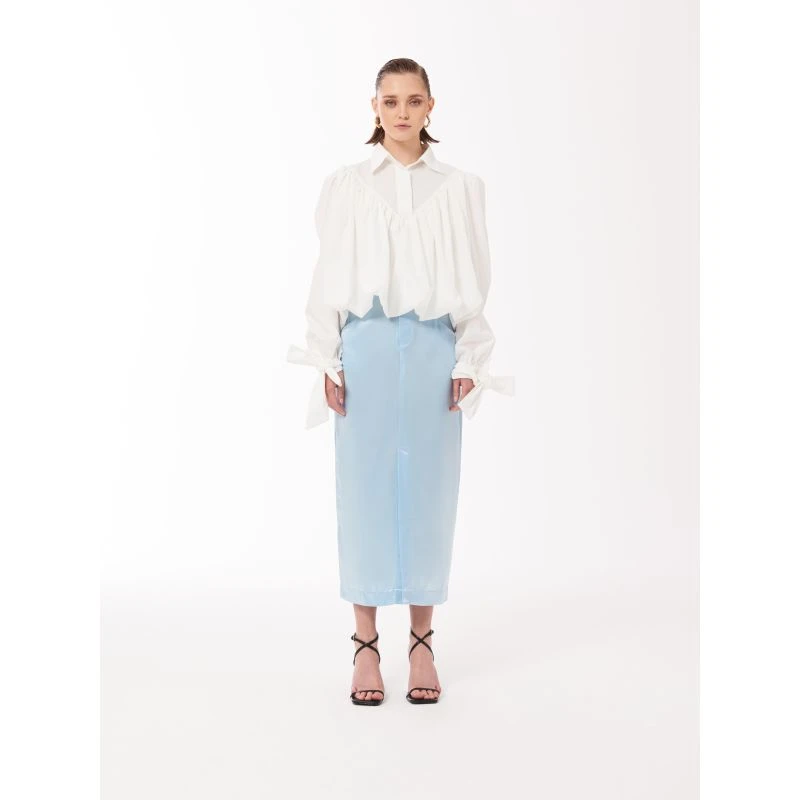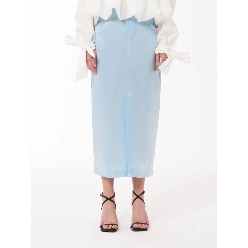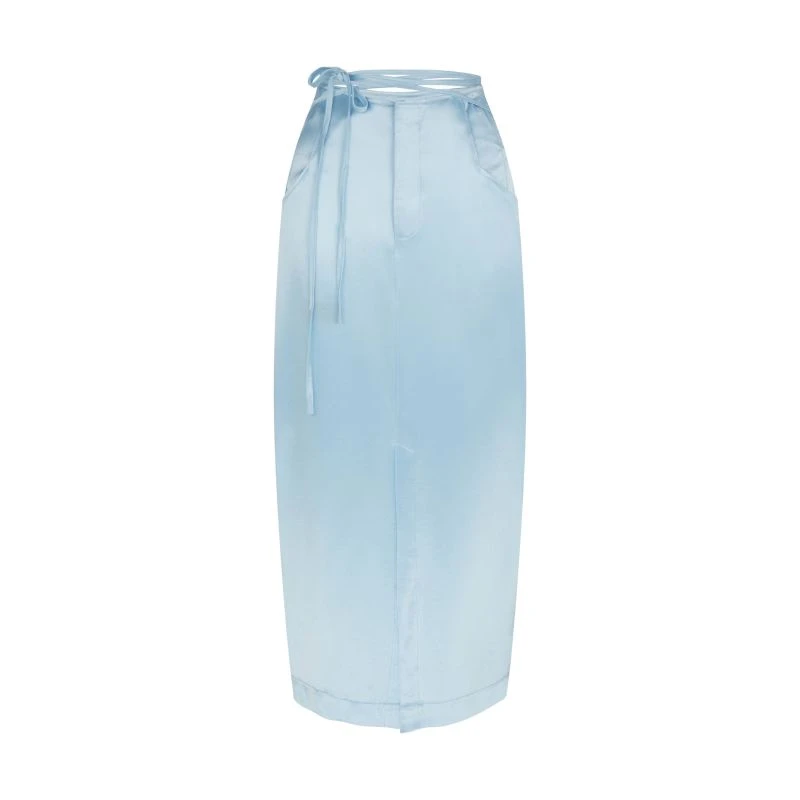Be effortlessly stylish with this baby blue skirt. It features a midi fit, baby blue satin finish and tie waist detail. Style with our Volume-pleated Tie Cuff Shirt or just a white top to simply dress up or down.