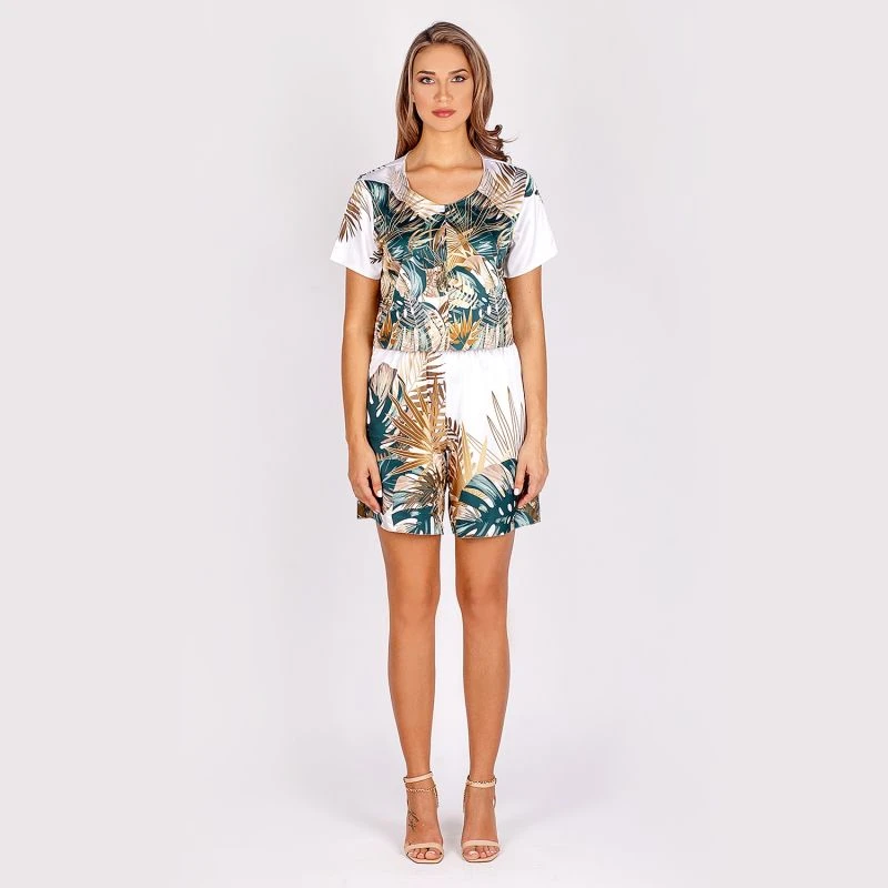 Short white satin Bermuda shorts with tropical print. The pants have a high elastic waist. We offer them in combination with a satin shirt of the same print for casual summer walks