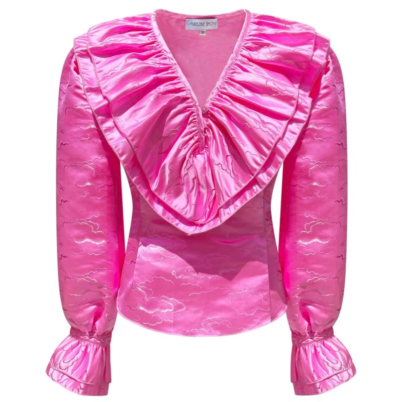 This blouse is made in custom cloud silk jacquard with dainty heart buttons for sleeve openings and around the neckline for closure. An oversize statement collar and nipped waist are some of the amazing design features of this blouse.