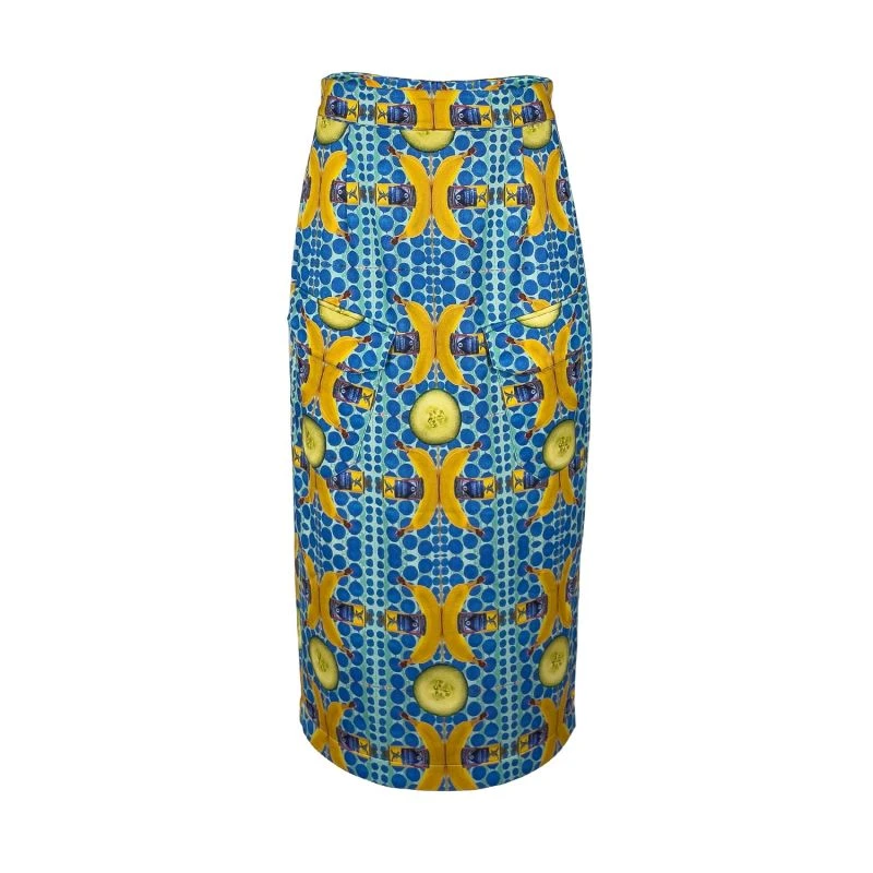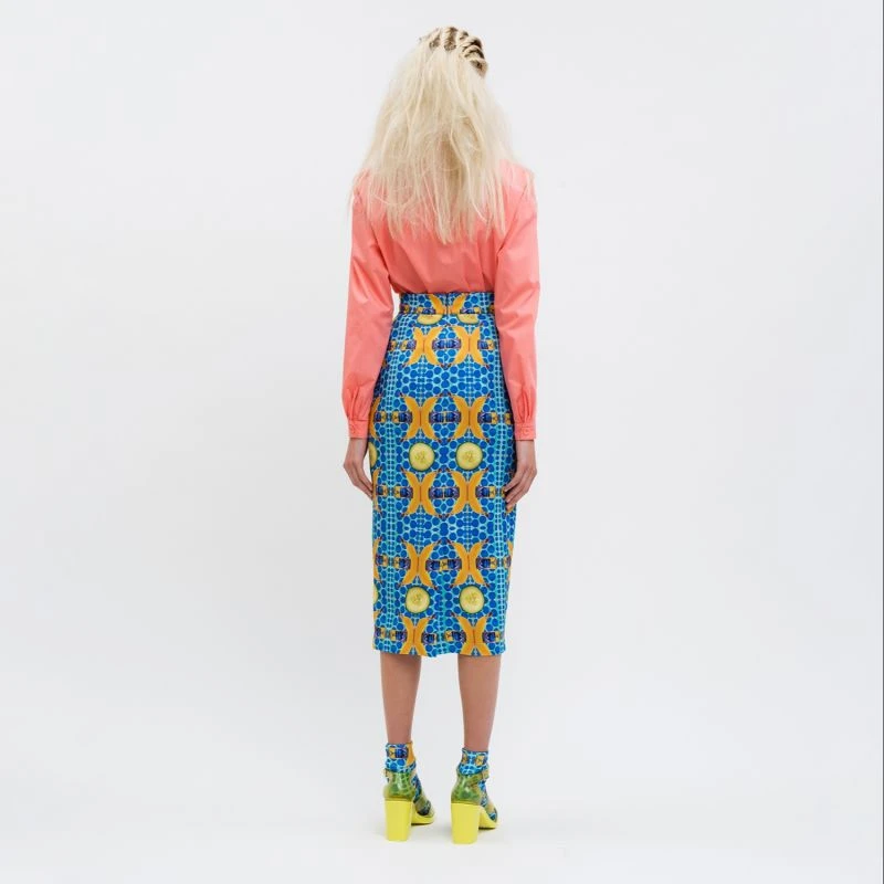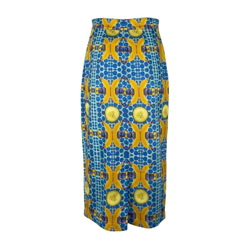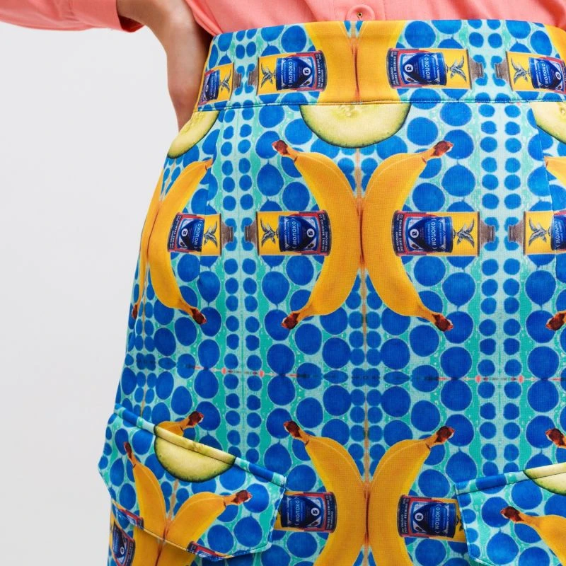 The “Banana” pencil skirt with geometrical front pockets is a stylish and modern addition to your wardrobe. The all-over print features a reference from Laima Jurča collection “Piecgades ģenerālmēģinājums”. The over the knee pencil skirt fit provides a sleek and sophisticated look. Made from a “Sandwich” jersey fabric – the inside is composed of cotton 60% and the outside is made of polyester 40%, making it lightweight, breathable and does not wrinkle. The elastic fabric ensures a perfect fit and allows for ease of movement. The geometrical front pockets add a touch of edginess to the skirt. This skirt is perfect for pairing with a blouse or sweater for a professional look, or with a t-shirt for a more casual style.