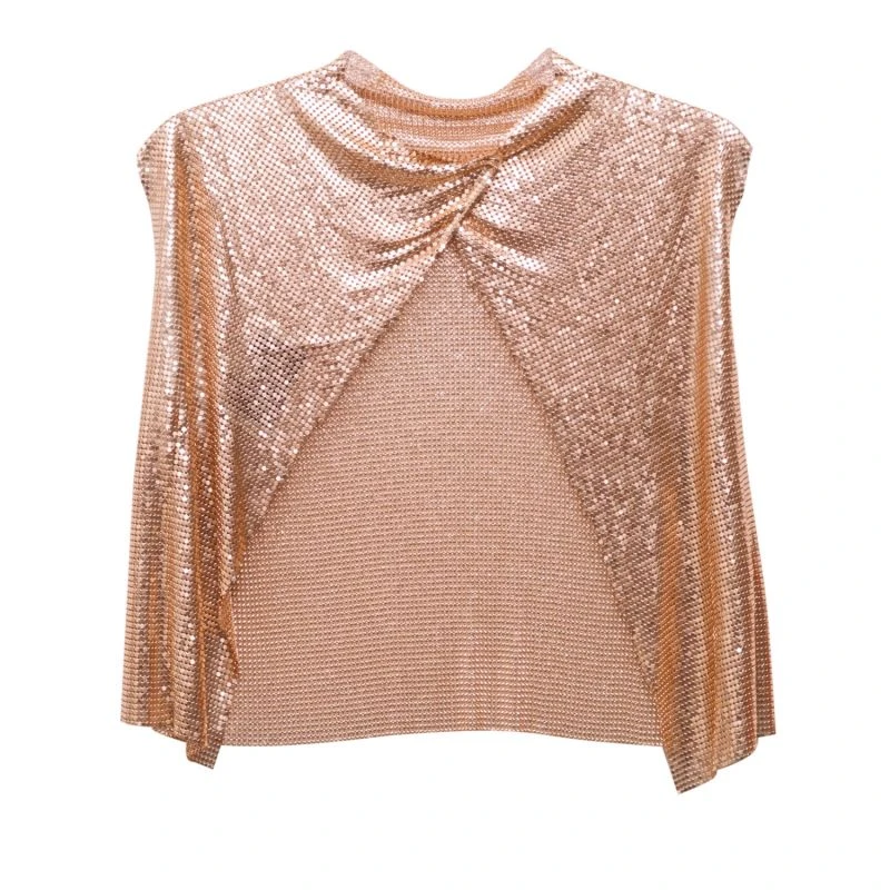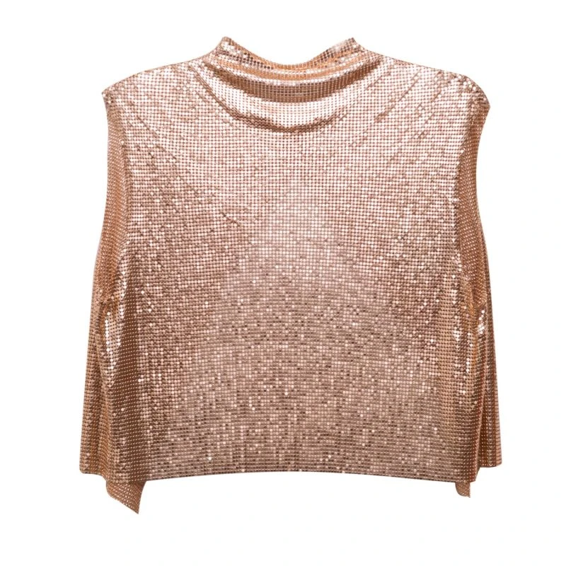 This is a chainmail satin metal gold rose crop top with a high neck that can be adjusted with pinch snaps and hooks. This piece is handmade and has no seams.