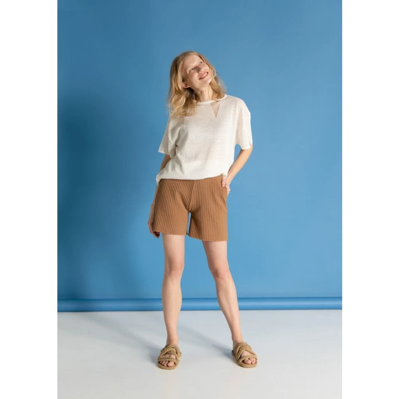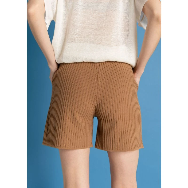 Terra shorts are ribbed for tactility and style edge. They have pockets and sit high on the waist falling to relaxed straight legs. The waist is on a soft elasticated band that can be adjusted to your size with a hidden inside button. To keep up with sustainability factors we’ve chosen viscose with a bit of stretch polyester that makes them elastic, durable and extra comfortable. Designed consciously with a good fit, feel and comfort. Pair them with the coordinating Donna bralette, Prima cardigan or style with most T-shirts and tanks. Perfect for lounging at home or out running errands. Each item is locally made in Lithuania.