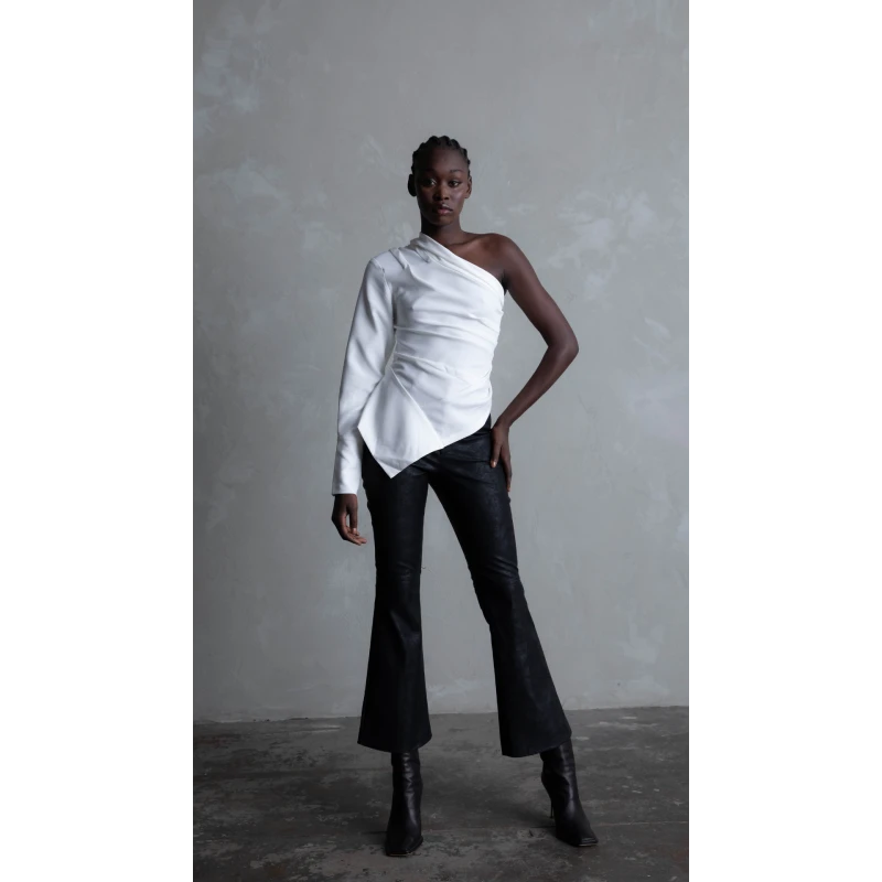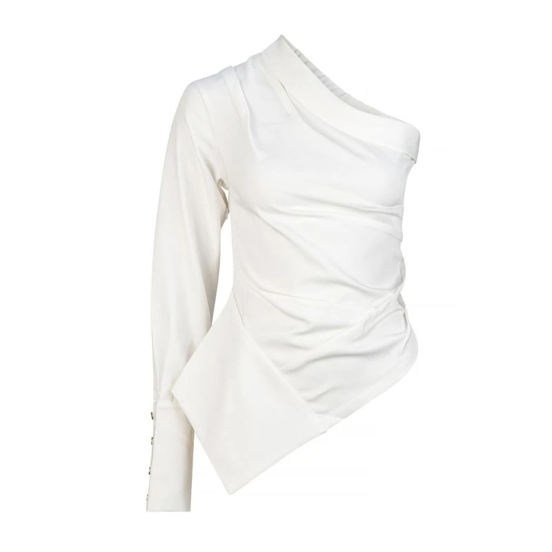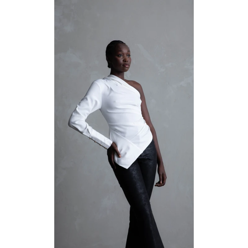 One shoulder top with a foldover neckline and a statement cuff. Cut for a close fit.
