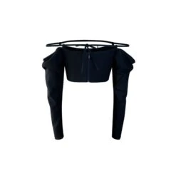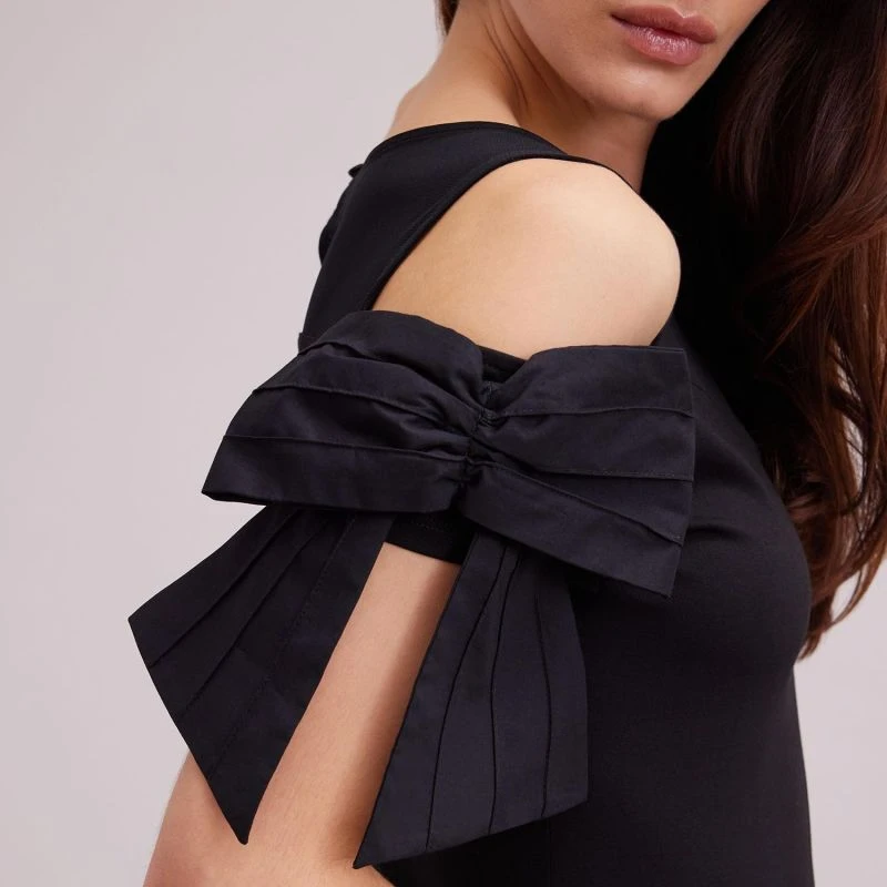 The VIRTYL is a cotton black top enhanced with a delicate sheer yoke with a sweetheart neckline. This top features cold shoulders decorated with poplin black bows creating a short sleeves style. There is a single button in the back for closure with keyhole detail. The VIRTYL is made of soft and stretchy jersey cotton that fits close to the body for a flattering shape.