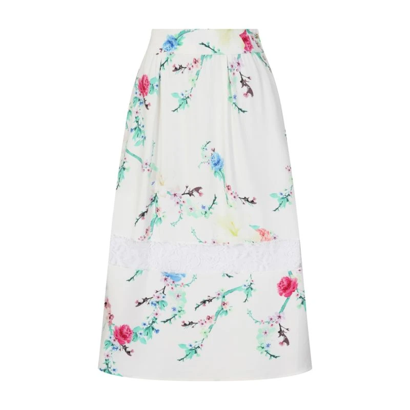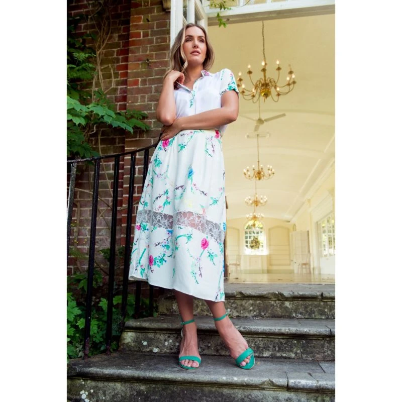 This Midi Skirt is definitive in comfort and elegance. The A-line shape is designed to complement each and every blouse in the Sophie Cameron Davies collection. The feminine design incorporates structured panelling, featuring SCD’s signature Italian lace. Cut from a bespoke cherry blossom print. All Sophie Cameron Davies skirts are luxuriously hand finished with our custom-made gold-edged buttons.