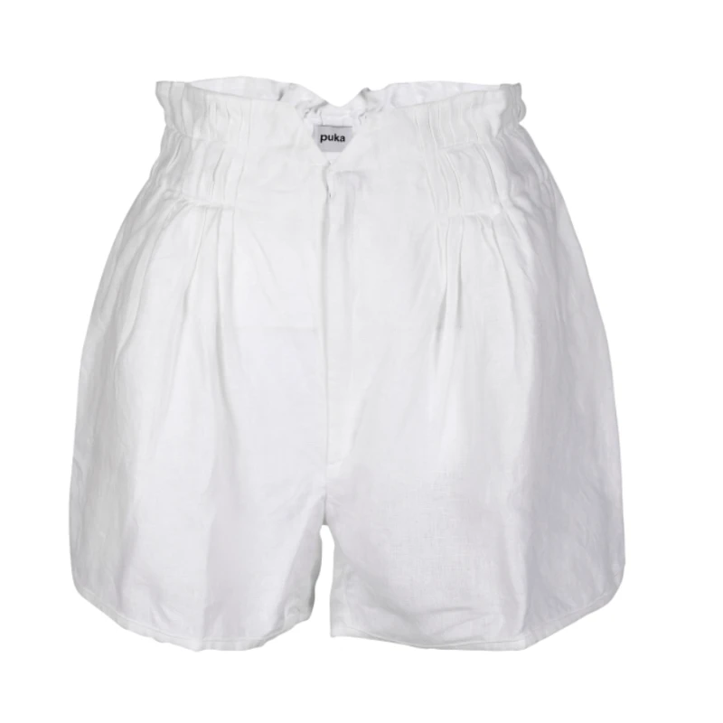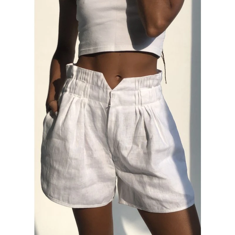 The Pantai short – an easy-to-wear linen short seen with the macrame belt in white.